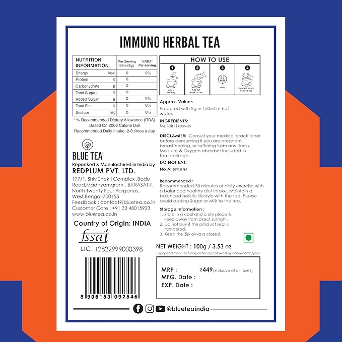 BLUE TEA – इम्यूनो टी – 100 ग्राम -100 कप || मुलीन – अश्वगंधा – गुलाब || इम्यूनो बूस्टर, कैलोरी बर्नर | कैफीन मुक्त – लस मुक्त – शून्य चीनी | ज़िपलॉक पैक