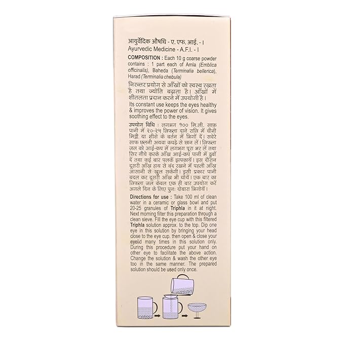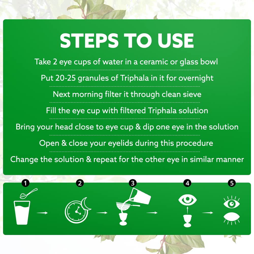 - उपयोग के लिए दिशा: कांच के कटोरे में 100 मिलीलीटर साफ पानी लें और रात में त्रिफला के 20-25 दाने डालें। अगली सुबह इस तैयारी को फ़िल्टर करें हालांकि एक साफ चलनी। अपने सिर को आइज़ कप के करीब लाकर इस फ़िल्टर्ड Tripahla सॉल्यूशन से आई कप भरें। फिर इस घोल में अपनी पलक को कई बार खोलें और बंद करें। इस प्रक्रिया के दौरान उपरोक्त कार्रवाई को सुविधाजनक बनाने के लिए अपना हाथ दूसरी आंखों पर रखें।